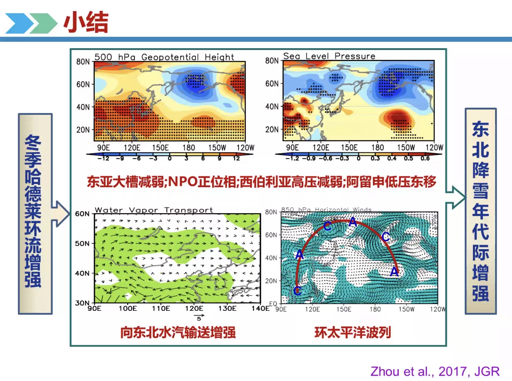 第三部分,从人类活动、Hadley环流和北大西洋年代际振荡(AMO)方面讨论了降雪变化的物理机制。人类活动将明显增加北半球部分区域的强降雪事件;冬季Hadley环流增强,激发环太平洋波列,向东北输送的水汽增强,东北降雪年代际增强。此外,AMO的位相转换是影响1990s出现的北方暴雪由少变多年际变化的重要因素。
