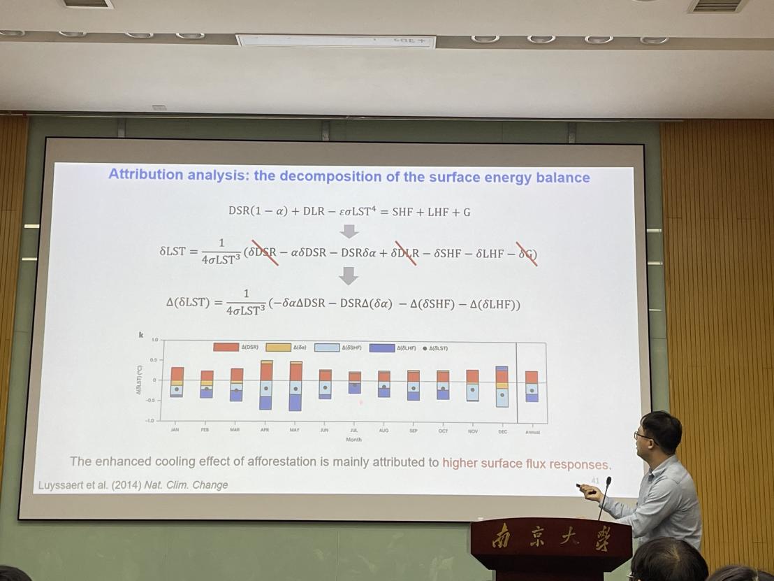 在本次报告中,葛骏老师首先介绍了人类活动驱动的大规模的森林覆盖变化,简要介绍了森林覆盖变化对于气候的重要影响,指出理解森林覆盖变化如何通过生物物理过程影响气候可以帮助我们认识人类活动对气候变化的贡献,帮助制定未来应对气候变化的土地利用和管理政策。