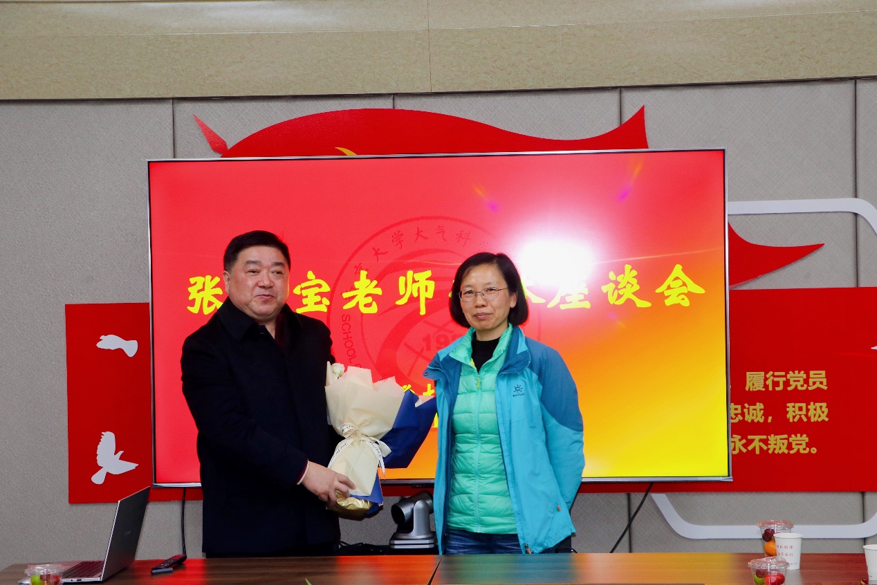 中尺度灾害性天气教育部重点实验室主任方娟为张少宝老师送上鲜花,祝愿他退休生活更加精彩。