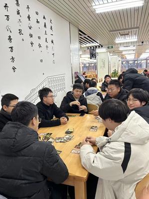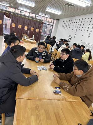 下午三点半,同学们陆续来到教工一餐厅,清冷的食堂渐渐热闹起来。为促进彼此交流,辅导员刘娜老师还带来了一些趣味桌游,作为活动前的预热。线下桌游欢乐多,有同学沉浸在“三国杀”“狼人杀”的斗智斗勇的欢乐中,也有同学在“掼蛋”“UNO”的比拼中卸下疲惫、释放压力。