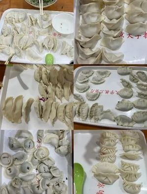 四点半活动正式开始。食堂准备了韭菜鸡蛋和白菜猪肉两种馅料,饺子皮也全部备齐。尽管“万事俱备”,但包饺子的过程并不简单:既要确保饺子形状美观,又不能让馅料外漏。好在,经过食堂阿姨的细心指导和同学间的互帮互助,心灵手巧的同学们都包出了属于自己的冬日限定水饺。造型各异的水饺蕴藏着巧妙创意,展现全国各地饺子形状图鉴。