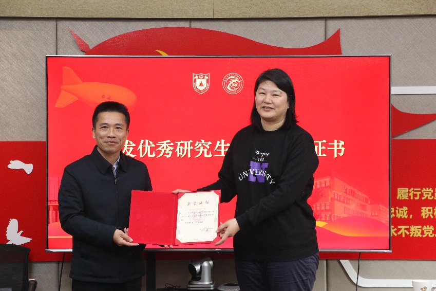 林仕尧书记为袁慧玲老师颁发公司优秀研究生德育导师荣誉证书