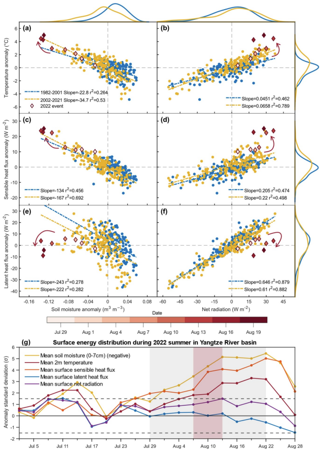 图(a)-(f)为1982-2022年7月28日到8月20日长江流域温度、感热、潜热与土壤湿度、净辐射之间的相关关系;图(g)为2022年7-8月长江流域温度、感热、潜热、土壤湿度和净辐射标准化距平的变化趋势。