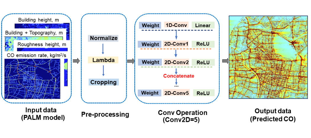 近期,张彦旭教授课题组利用机器学习方法、结合流体力学模型和城市形态学数据实现了城市区域超高精度空气质量的快速、准确预报。通过分析权重贡献和显著性图,得到不同输入特征的贡献,提高了深度学习模型的可解释性。该成果以“Predicting high-resolution air quality using machine learning: Integration of large eddy simulation and urban morphology data”为题,于2024年1月23日在线发表在《Environmental Pollution》杂志。论文第一作者为2020级博士研究生王士宝,通讯作者为张彦旭教授。