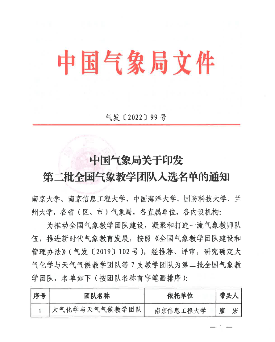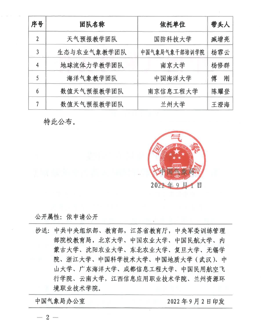 9月2日,中国气象局印发通知,公布第三届全国气象教学名师和第二批全国气象教学团队评审结果。公司由杨修群教授领衔的《地球流体力学》教学团队成功入选“第二批全国气象教学团队”。