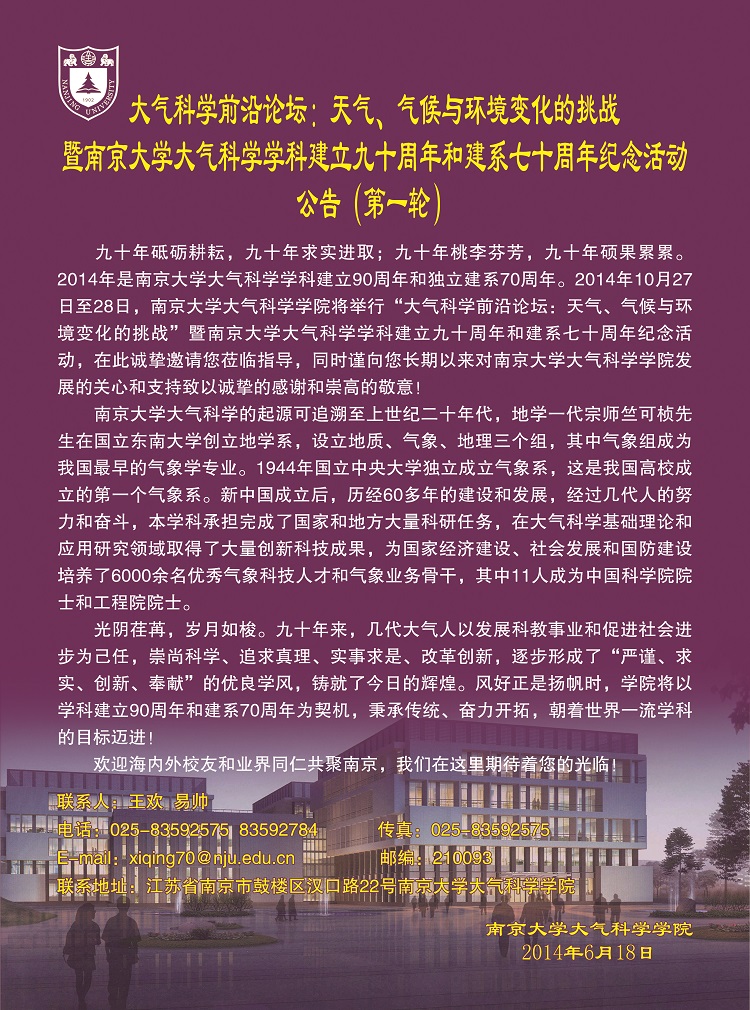 大气科学前沿论坛暨太阳成集团tyc234cc大气科学学科建立九十周年和建系七十周年纪念活动公告