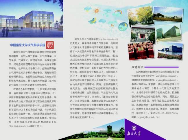 The School of Atmospheric Sciences at Nanjing University (NJU), China, is seeking outstanding applicants to fill 10 faculty positions at the ranks of associate and full professors, engaging in the research of meteorology, atmospheric physics, atmospheric chemistry, climate change, physical oceanography, Earth system science, and near-Earth space physics. The position requires a Ph.D. degree in atmospheric sciences or a related discipline, and strong potentials for research and teaching. For an appointment at full professor level, the applicant must also show an excellent record of research and professional accomplishments, for which professional experience as faculty or equivalent research position at oversea institute is preferred.