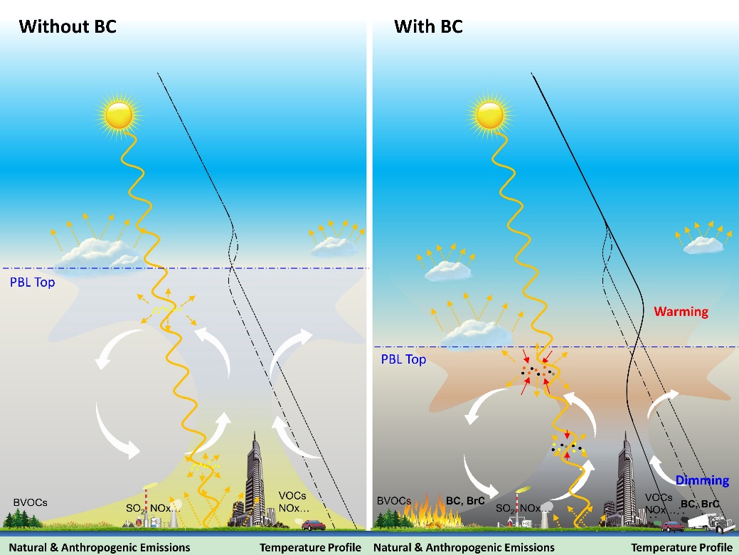 以PM2.5为主要特征污染物的大气复合污染问题是当前困扰我国的重大环境挑战。最近公司气候与全球变化研究院、太阳成集团tyc234cc符淙斌院士团队丁爱军研究组在地球科学著名期刊《Geophysical Research Letters》发表最新研究成果,揭示了大气中黑碳气溶胶的“穹顶效应(Dome effect)”是加剧超大城市空气污染污染的重要因素。