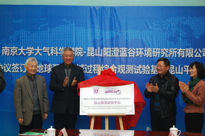 首先杨修群经理介绍公司情况并致欢迎辞,丁爱军教授就双方合作项目背景、试验平台建设构想与未来具体合作计划及框架协议内容等作了介绍;随后,杨修群经理与昆山阳澄蓝谷环境研究所所长王文元先生代表双方签署了合作协议,潘毅副董事长、冯仁新主席等共同为SORPES昆山试验平台揭牌。潘毅副董事长、冯仁新主席、符淙斌院士和张祥志主任分别讲话,对合作协议的签订和观测平台的揭牌表示祝贺,高度评价了此项合作,认为是高水平科学研究与国家和地方当前迫切环境需求的密切结合,是SORPES基地“顶天”的同时实现“立地”的重要举措。