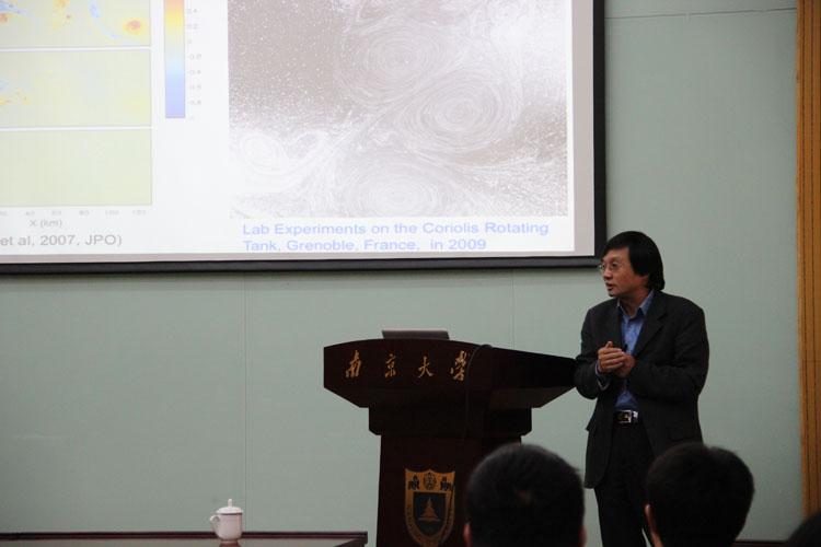 董昌明教授的报告针对海洋中尺度涡旋研究方面的热点和前沿问题,重点介绍了海洋多重尺度特征分析,特别是利用现有海洋观测资料诊断海洋中尺度涡旋方面的最新研究成果。海洋中尺度涡旋在中纬度海洋中广泛存在,并具有重要的科学研究价值,对上层海洋的热含量、海面温度锋面强度等大气数值模式的强迫场也存在直接影响。董昌明教授的报告中,详细介绍了如何利用现有的海洋观测数据建立一套北太平洋单独的海洋中尺度涡旋资料场,特别是建立与海洋涡旋相匹配的中纬度低层大气对中尺度海洋涡旋响应的高时空分辨率的数据集。该数据集的建立将更好的体现中尺度海洋涡旋对海面温度锋面强度、中纬度低层大气斜压响应特征,以及对中纬度大气急流轴变化等方面的影响。