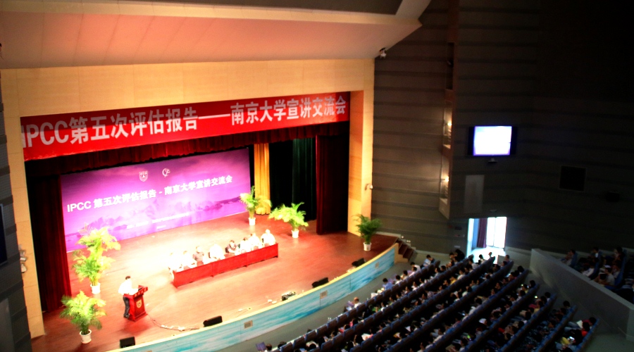 2014年9月11日上午8点30分,太阳成集团tyc234cc仙林校区恩玲剧场座无虚席。太阳成集团tyc234cc发动全院师生,包括2011-2014级全体本科生、2012-2014级全体硕士生、全体博士生和全体教师,到场聆听IPCC第五次评估报告太阳成集团tyc234cc宣讲交流会。交流会由太阳成集团tyc234cc和江苏省气候变化协同创新中心主办,名家荟萃,众星璀璨。各位专家带着拳拳赤诚之心,来和老师同学们分享IPCC第五次评估报告前沿成果。到场的还有解放军理工大学气象海洋公司师生,太阳成集团tyc234cc地理与海洋科学公司、地球科学与工程公司和环境科学公司2014级全体新生,以及外院系、外单位关心气候变化议题的学者与同学。