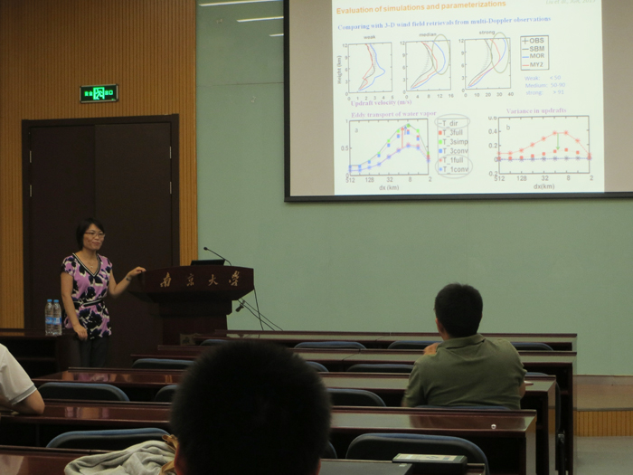 6月18日下午,美国太平洋西北国家实验室范霁雯研究员应公司陈宝君教授邀请,在仙林校区大气科学楼为全院师生做了题为“Interactions of Deep Convective Clouds with Aerosols: from Physical Understanding to Parameterizations”的学术报告。范霁雯博士是WRF-SBM(谱分档微物理方案)的重要贡献者,利用该模式模拟研究了气溶胶对深对流云和降水的影响及其气候效应,得到了一系列重要成果。报告会上,她主要介绍了其PNAS上的工作内容,并就如何改进数值模式中微物理参数化方案提出了自己的见解。