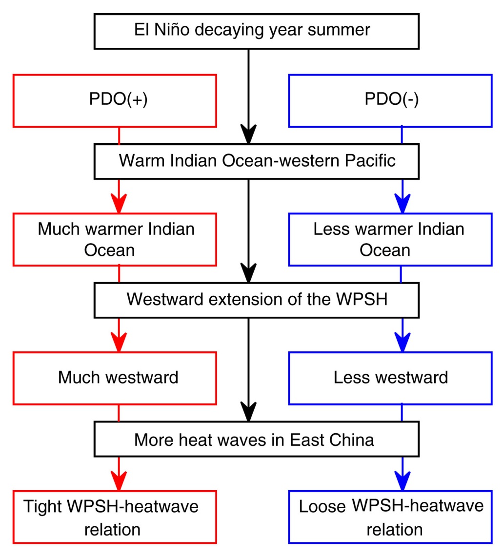 图2,不同PDO的不同位相在厄尔尼诺衰变期如何通过调节西太副高调节中国东部夏季高温的机制图。