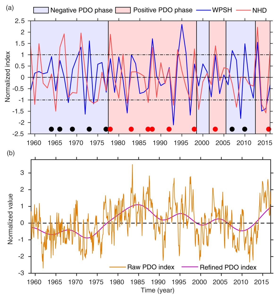 图1, (a)标准化的年际尺度的西太副高(WPSH)和高温日数(NHD)指数。红点和黑点分别代表在PDO正位相和负位相期间的厄尔尼诺衰减年夏季。(b)原始的逐月PDO指数(橙色)和滤波后的PDO指数(紫色)。