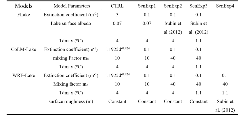 进而针对这些模式误差通过一系列敏感性试验研究了湖面反照率、湍流混合系数、消光系数、湖面热力和动力粗糙度以及湖水最大密度对应的温度(表1)对各湖泊模型模拟性能的影响,发现将湖水最大密度对应的温度从4oC调整为1.1oC可以明显改进湖泊模型对纳木错湖冬季湖水温度垂直廓线的模拟效果,同时发现,采用参数化的湖面粗糙度、减小消光系数以及增加湍流混合系数能够较好地改进CoLM-Lake和WRF-Lake模型对夏季湖水温度廓线演变特征的模拟能力,而在Flake模型中采用参数化的湖面反照率替换原始版本中的常值湖面反照率可以明显提升对湖水温度廓线演变特征的模拟效果(图2)。