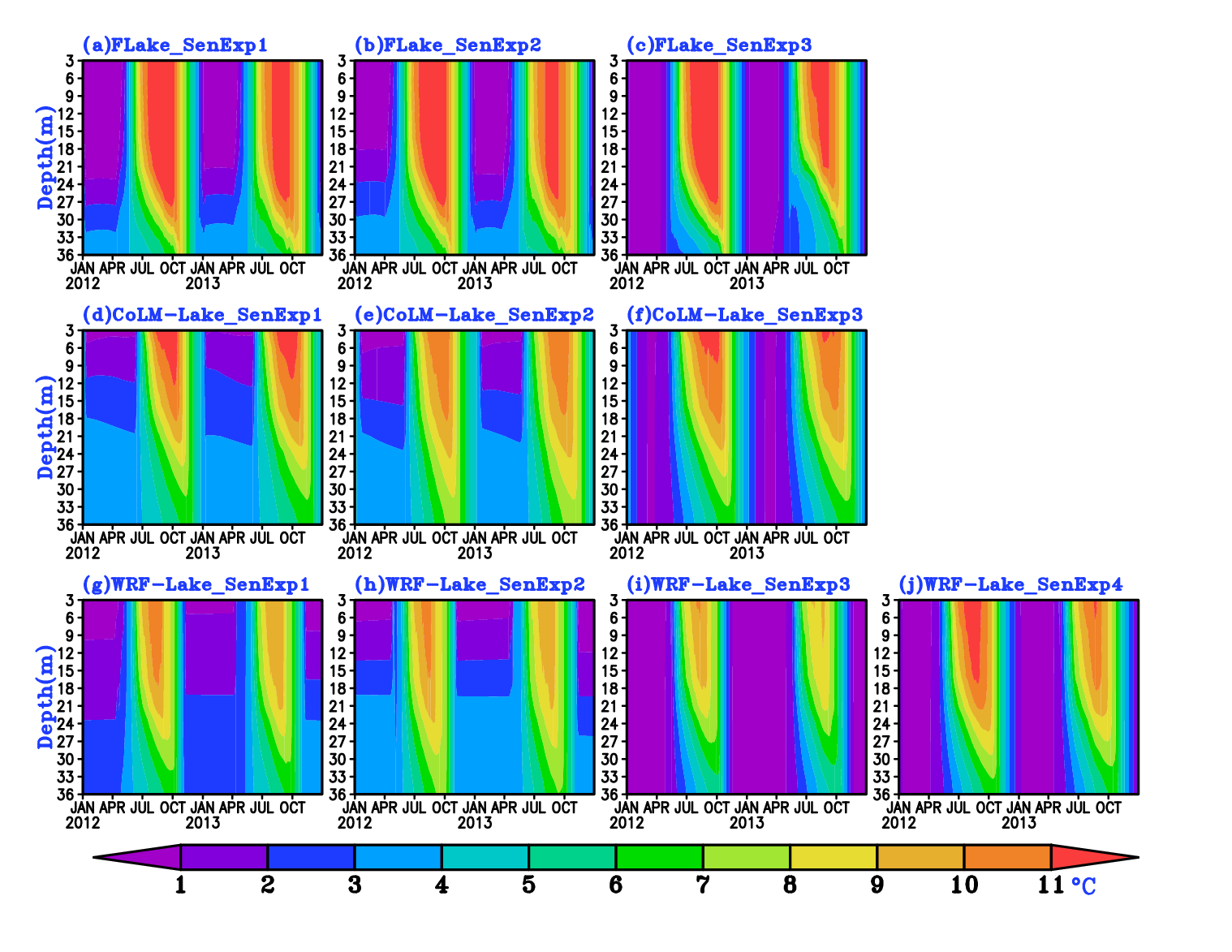 图1.观测和各原始版本湖泊模型模拟的湖水温度廓线演变特征