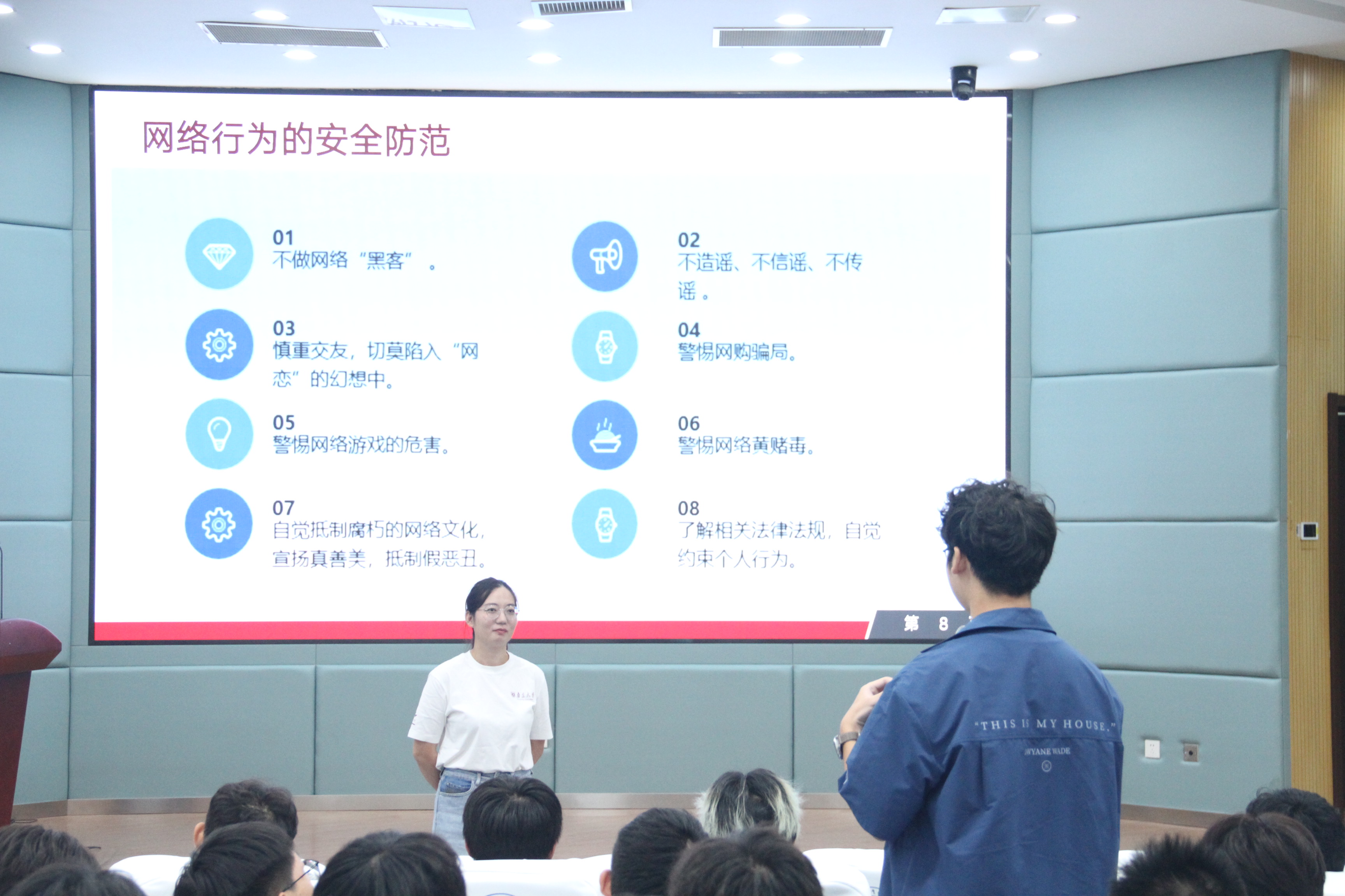 辅导员朱莉莉老师上台对同学们日后的大气专业课的学习生活做了必要的指导。她首先介绍了公司的发展历程、学科特色、科研平台、党建引领班团建设的育人共同体模式及育人成果并鼓励大家及早做好生涯规划,尤其强调获取信息资源的能力,建议大家仔细阅读《太阳成集团tyc234cc员工手册》。随后又重点提醒了同学们要拥有明辨是非的能力,谨防网络诈骗。同学们在了解到一系列创新创业、志愿服务和社会实践的公司特色品牌后,新进大气的本科生们斗志昂扬,意气风发,对大气的学习生活充满了期待。朱莉莉老师的这番指导鞭辟入里,言辞恳切,同学们都感到受益匪浅。