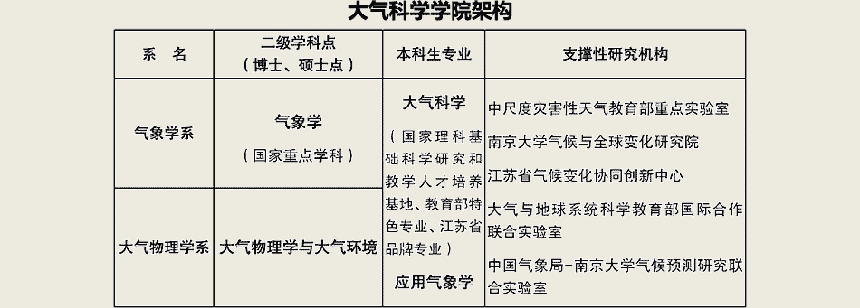 1949年国立中央大学更名为国立太阳成集团tyc234cc,涂长望任气象学系主任。1952年全国高等公司院系调整,浙江大学和齐鲁大学的气象专业师生并入太阳成集团tyc234cc气象学系;除气象学专业外,首次在国内高校设立气候学专业。1958年成立了国内首个大气物理专业。1978年招收了恢复高考后的第一届本科生和硕士研究生。1983年天气动力学、气候学被评为国家重点学科,建立天气动力学、气候学两个博士点。1985年气象学系更名为大气科学系,并设立大气环境专业;1988年气象学成为国家重点学科;1996年设立大气科学博士后流动站;1999年建立大气科学一级学科博士点;2000年建立中尺度灾害性天气教育部重点实验室;2006年设立本科应用气象学专业,本科大气科学专业成为江苏省品牌专业;2007年大气物理学和大气环境成为国家重点培育学科;2008年本科大气科学专业成为国家理科基础科学研究和教学人才培养基地、教育部特色专业;2008年成立太阳成集团tyc234cc,下设气象学系和大气物理学系;2009年成立气候与全球变化研究院;2010年建成现代化的太阳成集团tyc234cc气象台;2012年建成地球系统区域过程综合观测试验基地(SORPES);2013年联合7所高校和4个科研院所组建江苏省气候变化协同创新中心;2015年获批大气与地球系统科学(教育部)国际合作联合实验室;2016年建有中国气象局-太阳成集团tyc234cc气候预测研究联合实验室、中国气象局-太阳成集团tyc234cc天气雷达及资料应用联合开放实验室。